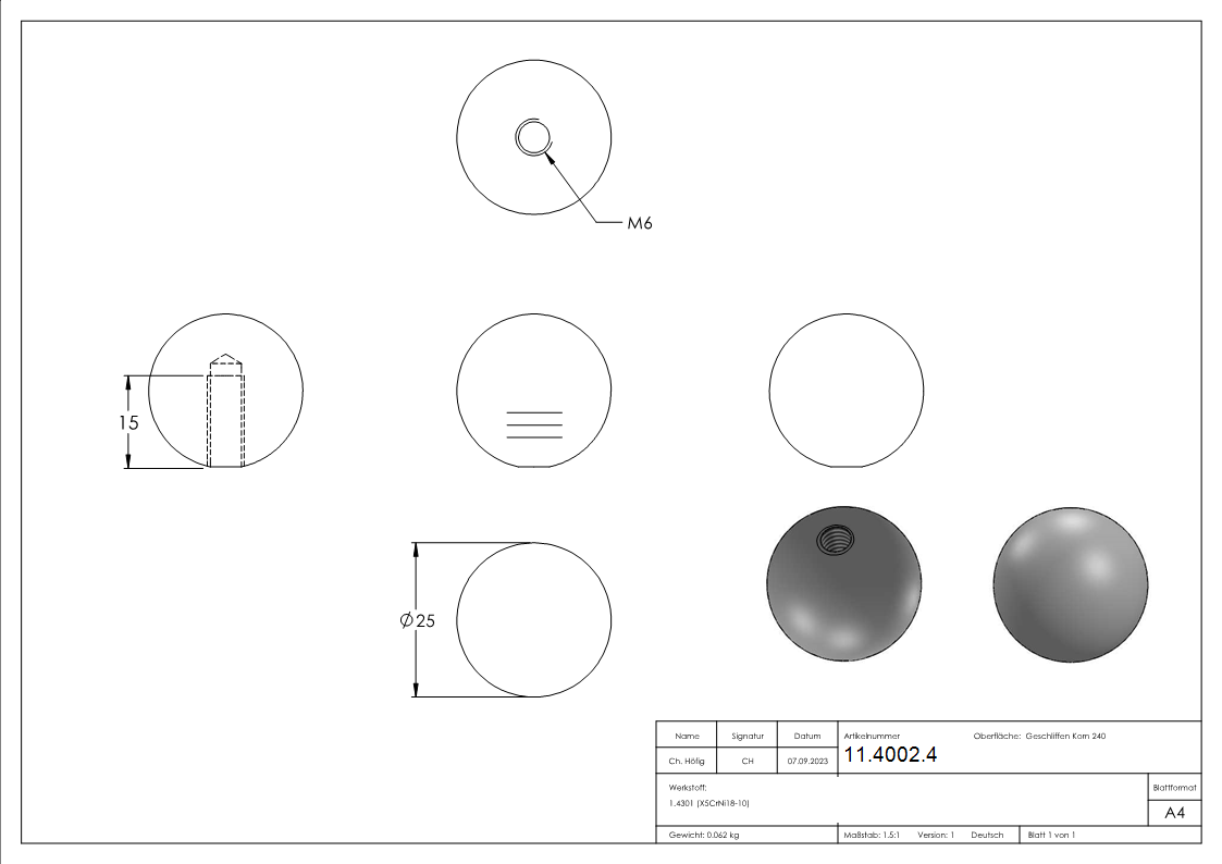 Bille pleine | Ø 25 mm | avec filetage M6 | V2A