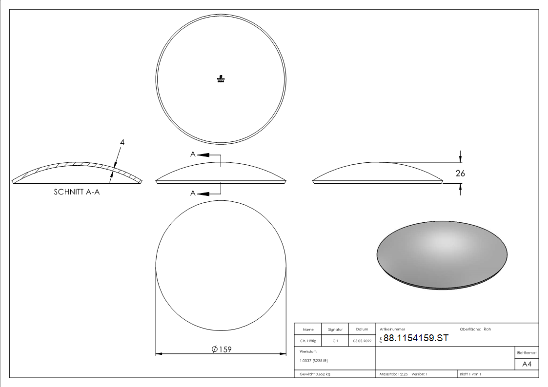 Coque semi-circulaire 159 x 4,0 mm, hauteur 26 mm
