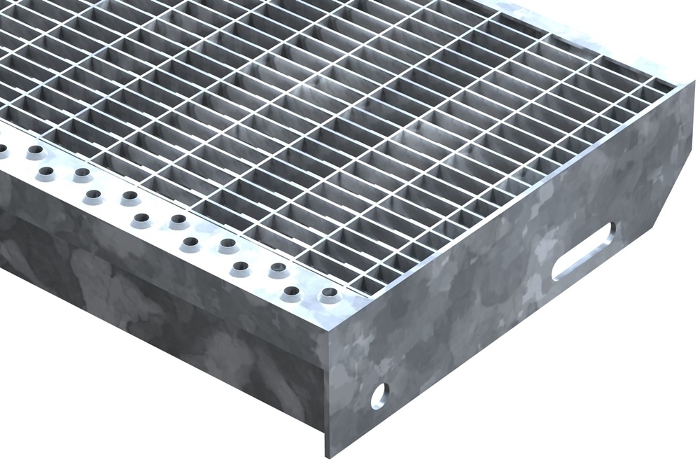 Caillebotis marche Marche d'escalier [ dimensions : 600x270 mm 30/10 mm ] S235JR (St37-2), galvanisé à chaud en plein bain[ détails techniques ] en S235JR (St37-2), galvanisé à chaud en plein bain[ détails spécifiques ] largeur (barres portantes) : 600 mm ; profondeur (barres de remplissage) : 270 mm ; maille : 30/10 mm ; barre de soutien : 30/2 mm[ autres détails spécifiques ] classe antidérapante : R10 ; avec pattes et bord d'attaque ; [ fabrication ] norme industrielle pour les marches selon DIN EN ISO 14122-3 ; charge individuelle de 1,5KN sur le cube de charge 100x100 au bord d'attaque[ remarque ] En raison de la galvanisation à chaud en plein bain, des résidus de galvanisation peuvent subsister dans les mailles !