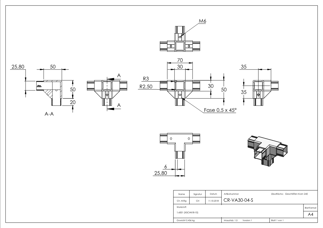 CORNECT® Pièce en T avec sortie latérale en set, pour tuyau 30x30x2,0mm, filet femelle M6 droite, V2A, incl.. :