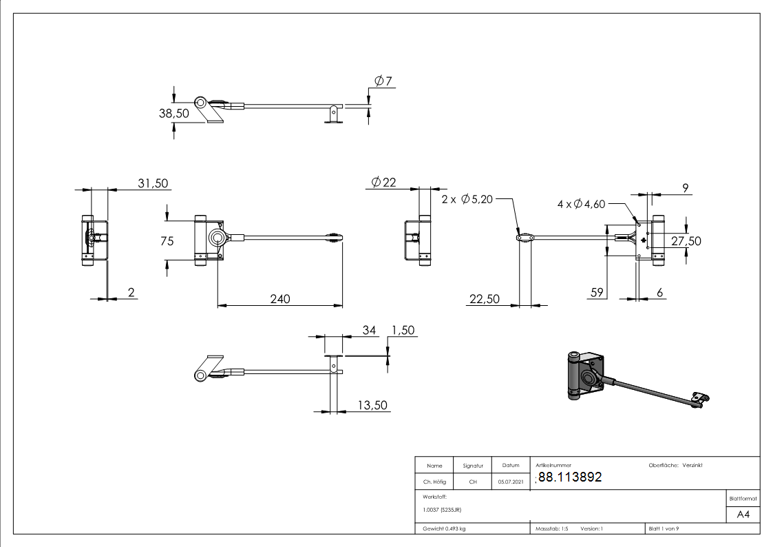Ferme-porte, galvanisé, longueur du levier : 235mm, pour portes jusqu'à 25 kg