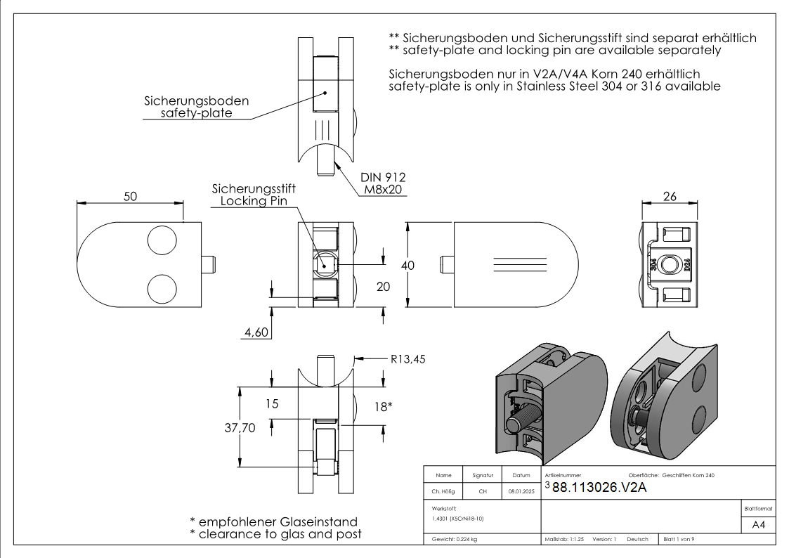 inkl. Befestigungsschraube M8 x 20, Klemmschrauben M6 x 14 und Abdeckplättchen