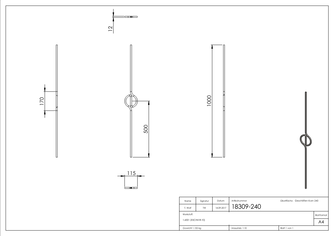 Ornement en forme de barre centré à partir d'un matériau rond V2A de 12 mm, d'une longueur de 1000 mm